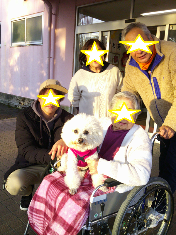 ご家族と一緒にわんちゃんとの面会がありました。久しぶりの再会に、ご利用者様はとても嬉しそうなご様子でした。わんちゃんを優しく撫でながら会話も弾み、笑顔あふれる和やかなひと時となりました。ご家族との温かな時間に、職員一同も心が和みました。