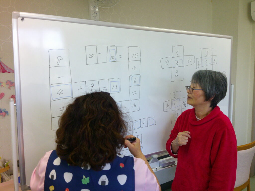 虫食い計算では、空白に数字を入れて計算式を完成されました。ひらがな共通穴埋めでは共通する1文字を考えながら単語を完成させ、ことわざ穴埋めにも取り組みました。普段は言葉の少ない利用者様も積極的に参加され進んで答えられる場面が多く見られました。皆さん終始楽しそうに参加され和やかな雰囲気で活動を行う事が出来ました。