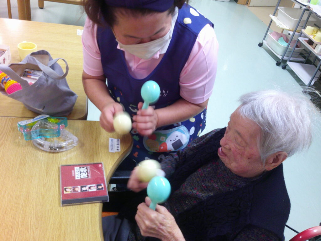 音が鳴ると満面の笑顔を見せられ、楽しそうに、時には不思議そうな表情を浮かべながら演奏されていました。 使用した楽器は小さな楽器でしたが、利用者様の手に取りやすく、無理なく演奏できている様子でした。