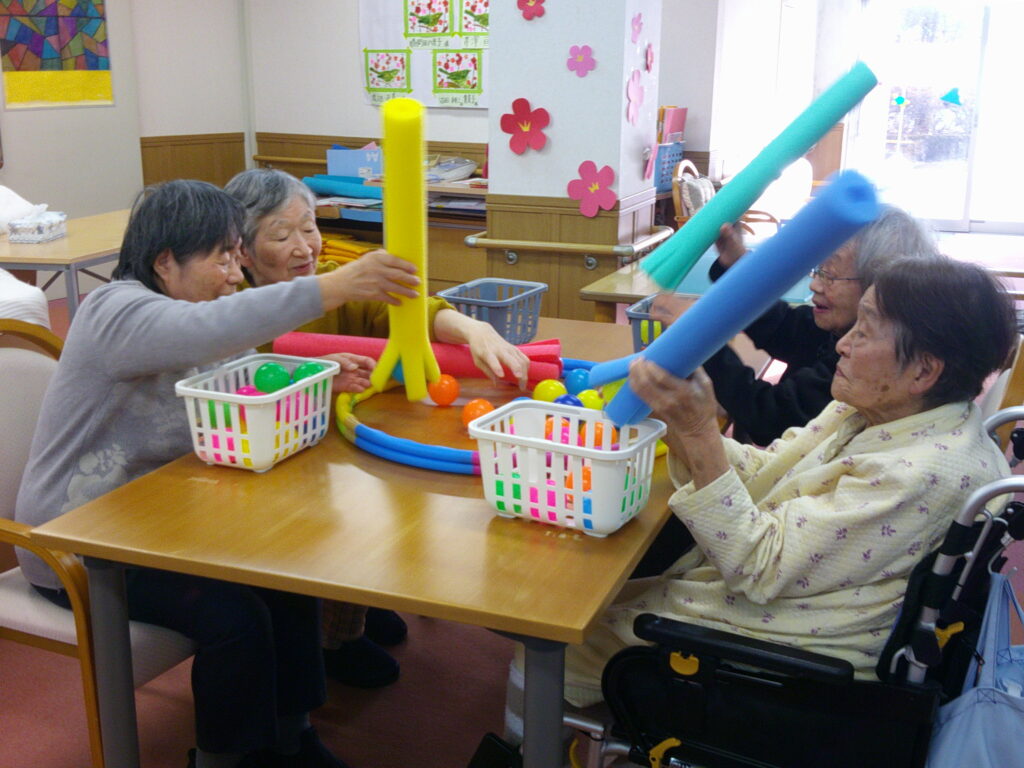 本日のレクリエーションは、発泡スチロールの棒を使ったボールすくい。
